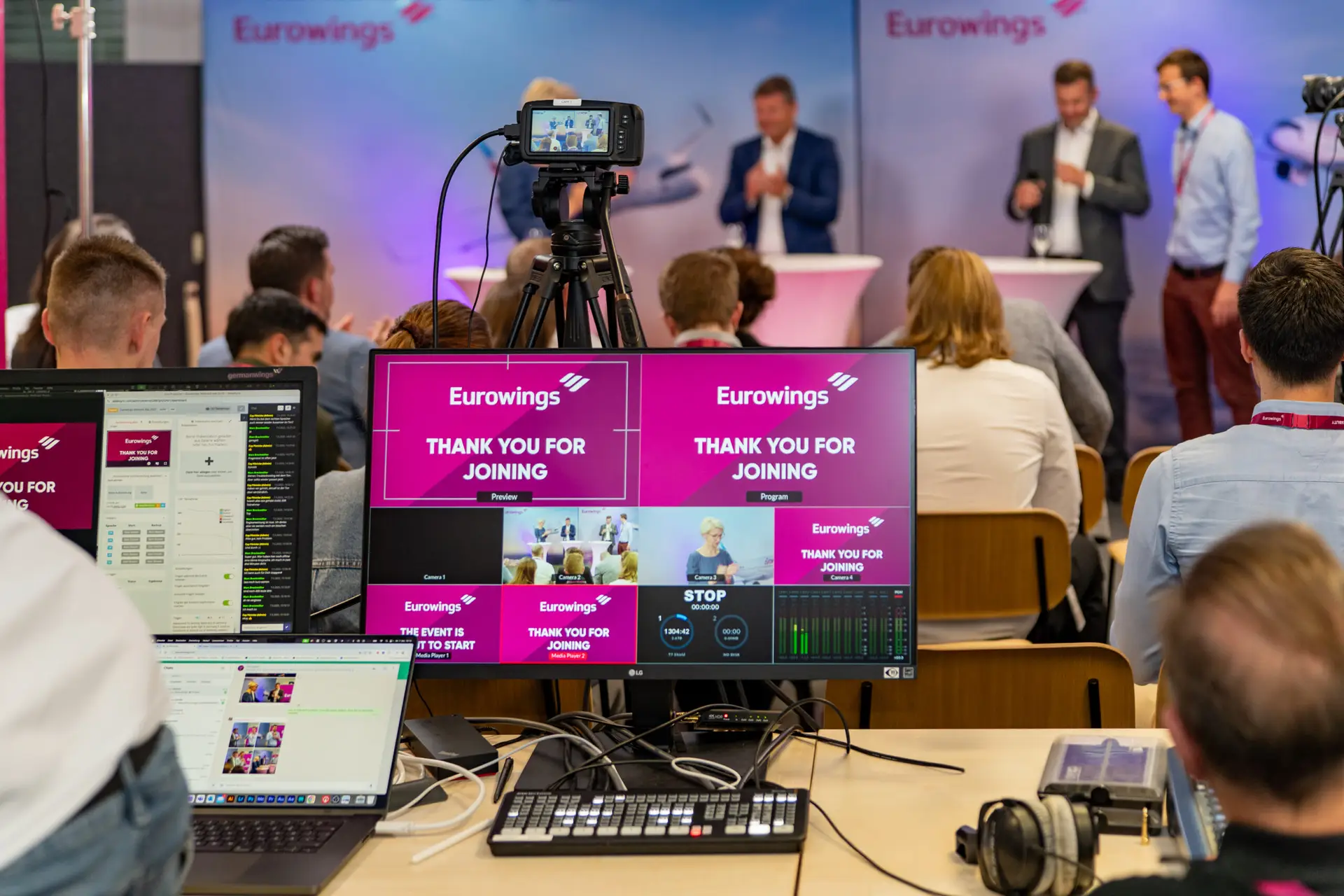 Für die interne Kommunikation bei EUROWINGS durfte ich die komplette technische Betreuung und Livestream-Regie des jüngsten Townhall-Events übernehmen. Der Aufbau fand bereits am Vortag statt, um einen reibungslosen Ablauf am Haupttag sicherzustellen.