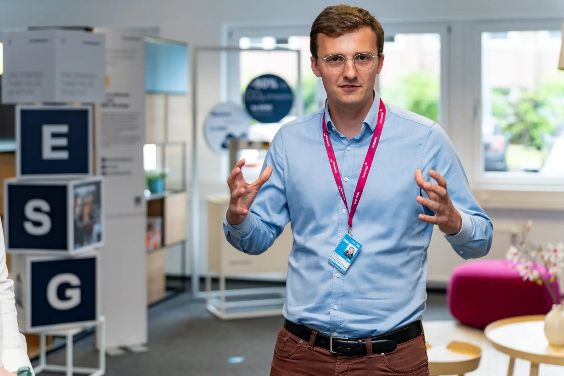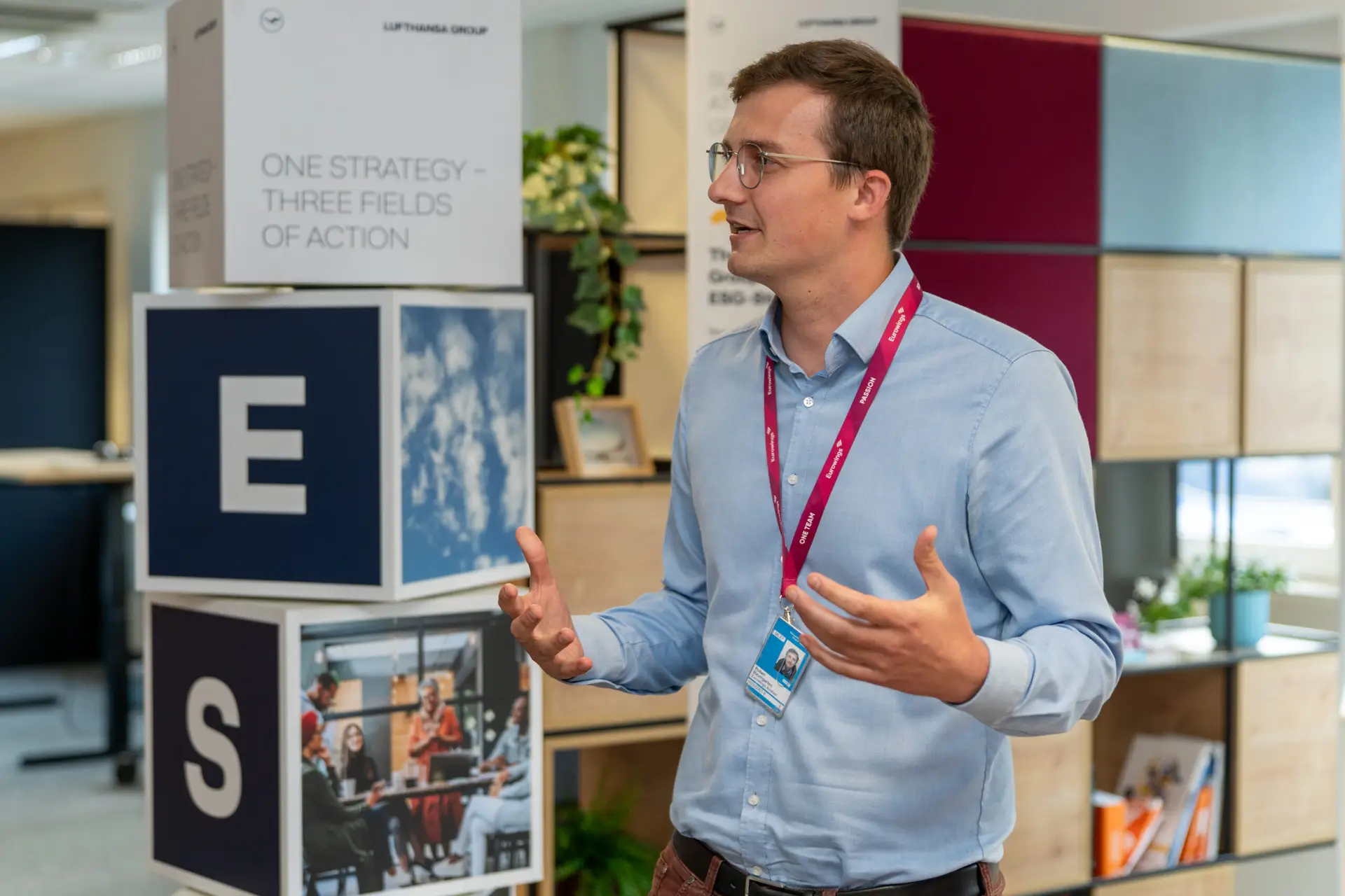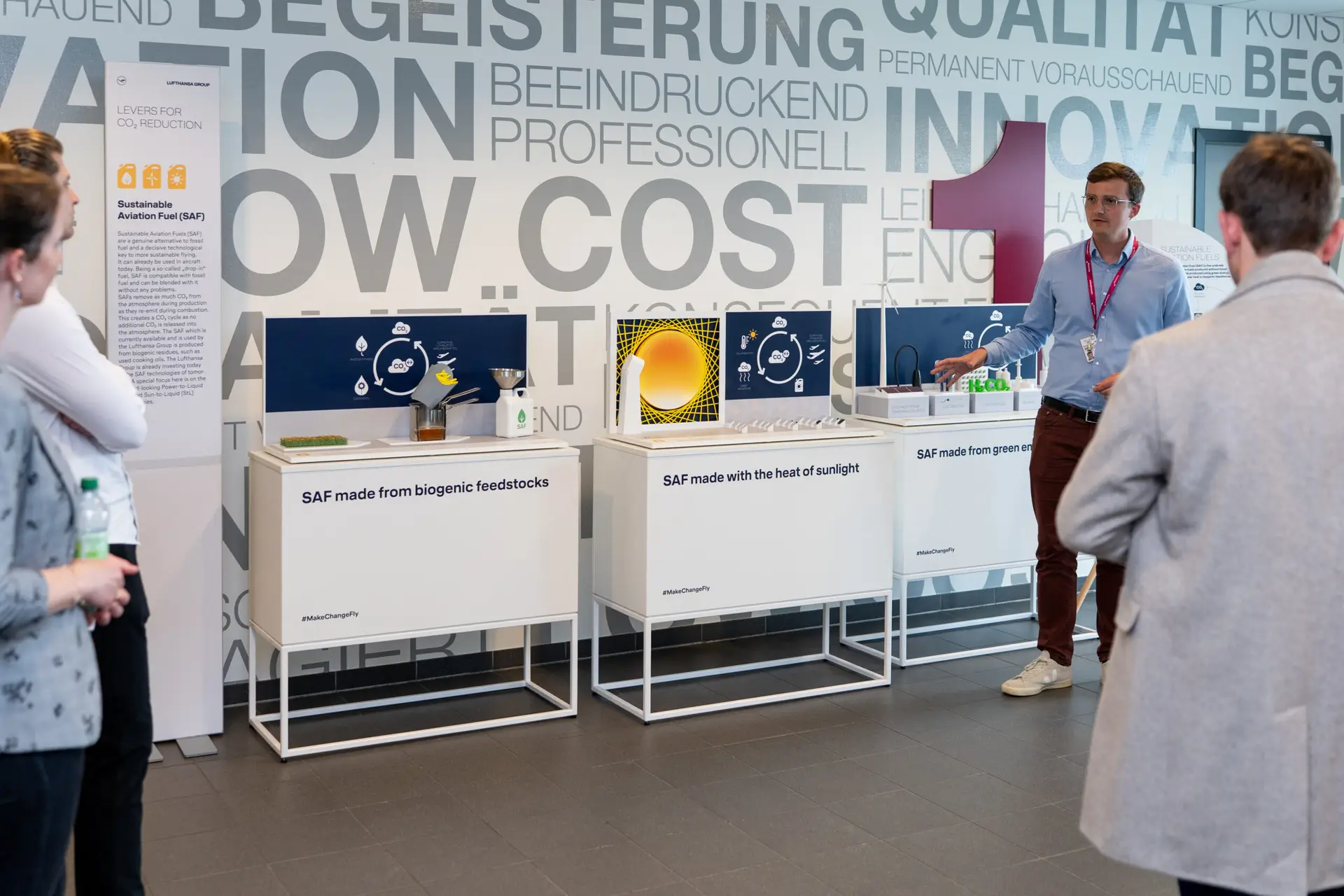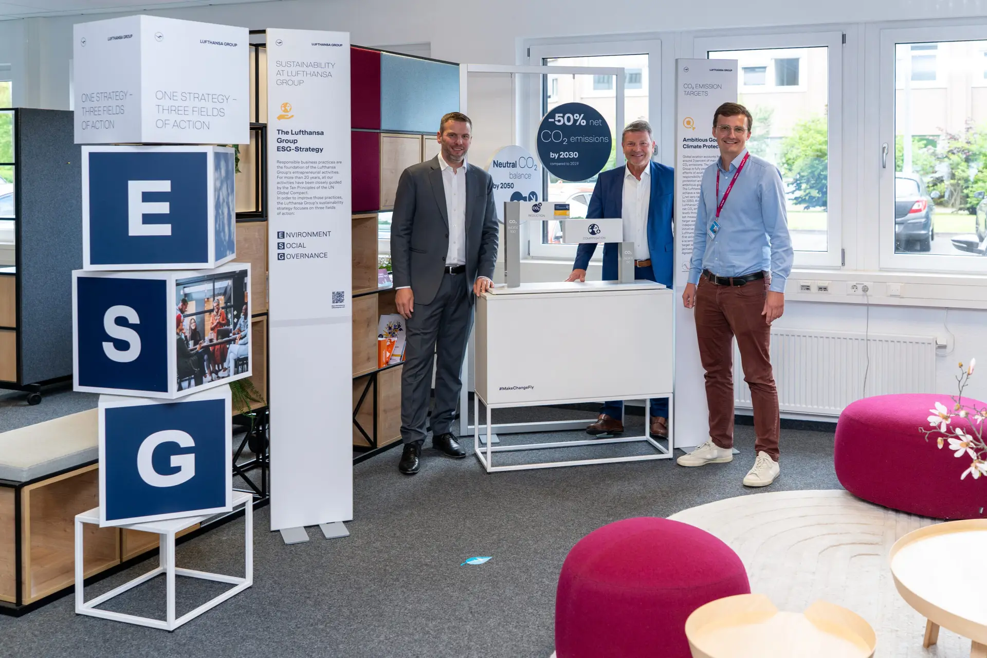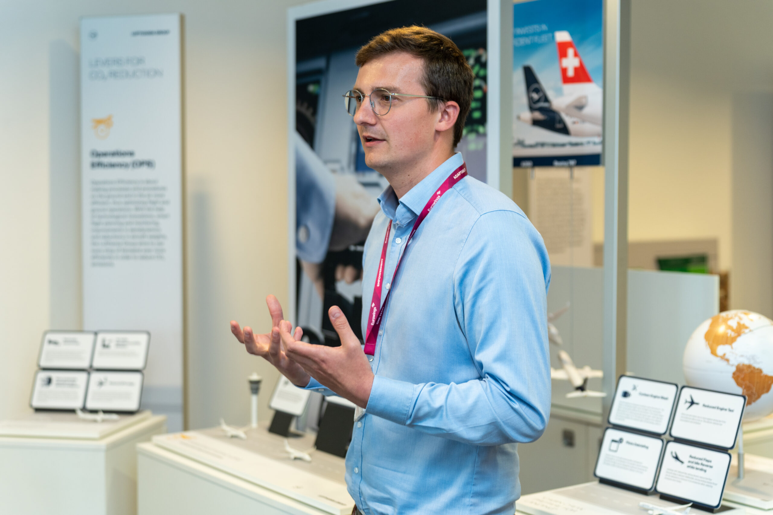 Unmittelbar nach dem Webcast eröffnete Edi Wolfensberger die ESG-Roadshow am Hauptsitz in Köln. Im Mittelpunkt standen acht interaktive Stationen, die die ESG-Strategie der Lufthansa Group erlebbar machten. Themen wie Flottenmodernisierung, der Einsatz von Sustainable Aviation Fuels (SAF) oder operative Effizienz zeigten konkrete Wege hin zum Ziel: CO₂-neutrales Fliegen bis 2050.
